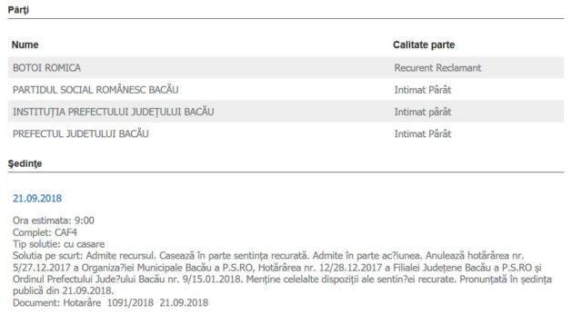 Curtea de Apel a decis, astăzi, să admită recursul înaintat de Romică Botoi și a anulat atât decizia de excludere din partid decisă de organizația municipală a PSRo cât și de cea județeană, dar și ordinul prefectului prin care decidea încetarea mandatului de consilier.