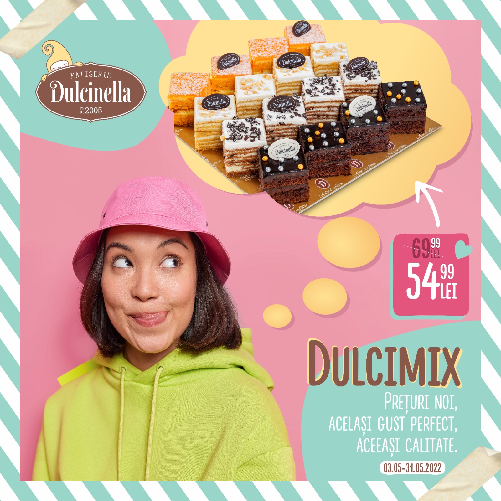 Dacă vă este dor să gustați cu prietenii mai multe prăjituri, cu arome diferite, „Dulcinella” vă sare în ajutor și vă oferă „DulciMix”, pentru momente dulci împreună, un platou cu mini prăjituri delicioase, la doar 54,99 lei. „DulciMix – prețuri noi, același gust perfect, aceeași calitate”, până pe 31 mai 2022.