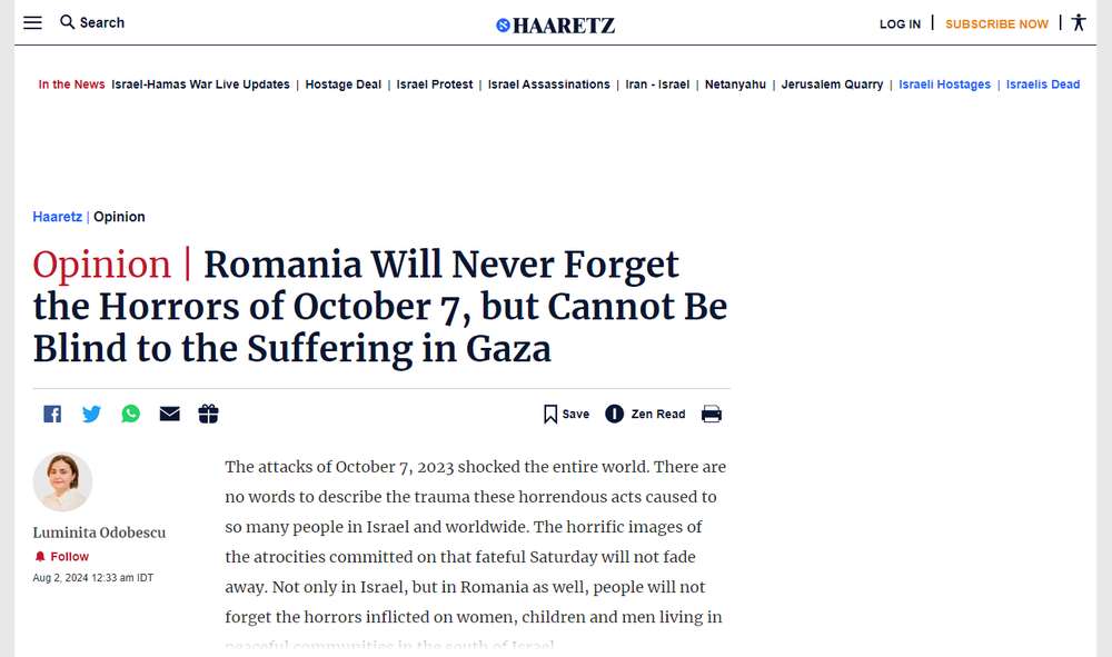 Ministrul de Externe al României, Luminita Odobescu, a publicat recent un articol în ziarul israelian Haaretz, abordând conflictul în curs de desfășurare între Israel și Palestina și subliniind importanța unei perspective echilibrate. În articolul său, Odobescu a declarat că Bucureștiul „nu va uita niciodată ororile din 7 octombrie”, dar a accentuat că România „nu poate rămâne orbă la suferința din Gaza”.