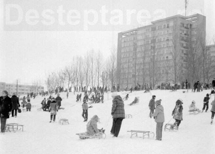 Fotografia, surprinsă în anii ’80, readuce la viață momentele în care nici frigul, nici obrajii înghețați nu-i opreau pe cei mici să se bucure din plin de iarnă. Cornișa era o adevărată arenă de bucurie: râsete, chicoteli, strigăte de încântare și sunetul inconfundabil al săniilor care alunecau pe pârtia de zăpadă. Pentru copiii de atunci, sania era cel mai mare motiv de fericire, iar zilele de vacanță se măsurau în numărul de coborâri pe derdeluș.