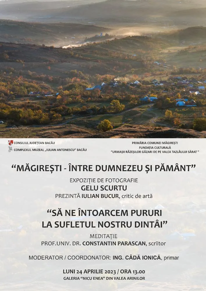 Talentatul și surprinzătorul artist fotograf moineștean Gelu Scurtu, va expune o parte dintre creațiile sale la Galeria „Nicu Enea” din satul Valea Arinilor al comunei Măgirești. Expoziția, care va fi vernisată luni, 24 aprilie, de la ora 13,00, este intitulată „Măgirești – între Dumnezeu și Pământ” și va fi prezentată de carismaticul critic de artă Iulian Bucur.