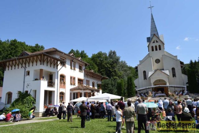Pe veranda clădirii din fața bisericii, la adăpost de ploaia repezită de vară, luni la amiază, părintele Augustin îmi spunea, privindu-mă în ochi:„Mâine nu va ploua! Niciodată nu a plouat, de când știu eu, când s-a ținut slujba în această zi atât de importantă pentru noi. Biserica a fost binecuvântată în 2002 dar lucrările au început mult mai înainte, în 1996. Demersurile pentru cumpărarea terenului s-au desfășurat în perioada 1993-94. S-a dorit a fi ridicată aici o mănăstire catolică, care să corespundă cerințelor carmelitane. Noi avem o carismă, un mod de a trăi în biserică într-un fel diferit de alte ordine religioase. Avem nevoie de un loc unde se poate trăi rugăciunea, într-un ambient izolat de oraș, așa cum este aici, înconjurați de pădure și liniște. Dar în același timp, ce s-a construit aici seamană și cu stilul mănăstirilor ortodoxe. Am vrut să corespundem ideii acesteia religioase, din România. Mănăstirile ortodoxe, mai ales în Moldova, sunt izolate în locuri care te îmbie să te reculegi în natură și rugăciune. Am vrut să răspundem vocației noastre de carmelitani dar și la ideea conceptului de mănăstire, după gândirea credinciosului român.”