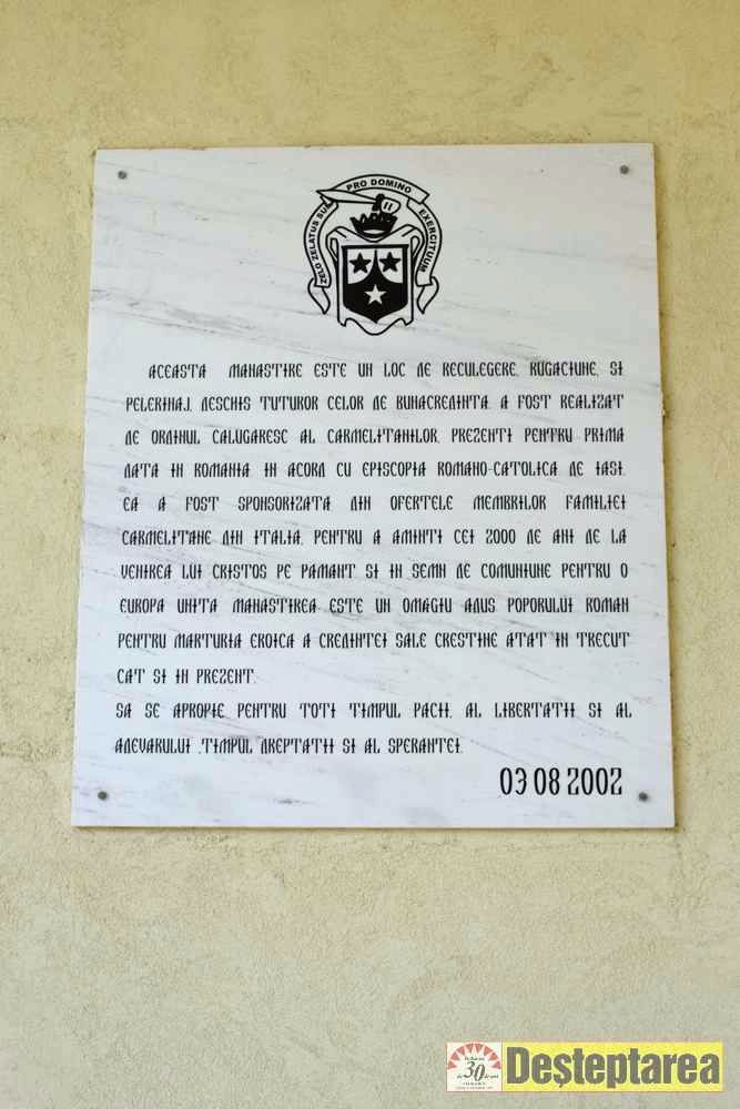 Compus din trei edificii, Centrul de Spiritualitate carmelitană, primul din România, a fost inaugurat în vara anului 2002. Atunci, pe 3 august, a fost sfințită biserica, în prezența părintelui Joseph Chalmers, Generalul Ordinului din Europa de Sud, a părintelui Claudio Bellotti, Provincialul Ordinului Carmelitan din Italia și a monseniorului Petru Gherghel, Episcop al Diecezei Iași. Le-au stat alături monseniorul Aurel Percă, monseniorul Ștefan Erdeș, Decan de Bacău, monseniorul Petru Mareș, preoți ortodocși, numeroși frați și surori aparținând ordinului, dar și mii de credincioși creștini din toată țara. Tot atunci a fost dezvelită și placa din marmură de la intrare, pe care este inscripționat mesajul membrilor familiei Carmelitane din Italia. Mănăstirea este un omagiu adresat poporului român, pentru mărturia eroică a credinței sale creștine, timp de două mii de ani de la venirea lui Cristos, dar și un semn de comuniune pentru o Europă unită.