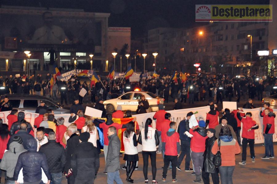 Dinspre Policlinica Veche a venit o coloana de circa 300 de persoane, organizata de PSD, in frunte cu deputatul Cosmin Necula. Manifestantii purtau steaguri, bannere si portrete ale lui Ponta si s-au adunat pentru cateva minute in fata Prefecturii, despartiti de un cordon de jandarmi si de Calea Marasesti de manifestantii pro-Iohannis.