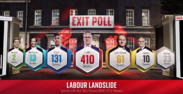 Rezultatele exitpoll-urilor, publicate imediat după închiderea secțiilor de votare pentru alegerile parlamentare anticipate din Marea Britanie, au înregistrat un eșec zdrobitor pentru conservatori. Pentru prima dată într-un sfert de secol, laburiștii vor reveni la putere, obținând o majoritate covârșitoare de locuri în Parlament – 410 din 650. Această victorie le va permite să-l aleagă pe liderul partidului, Keir Starmer, în calitate de șef al guvernului.
