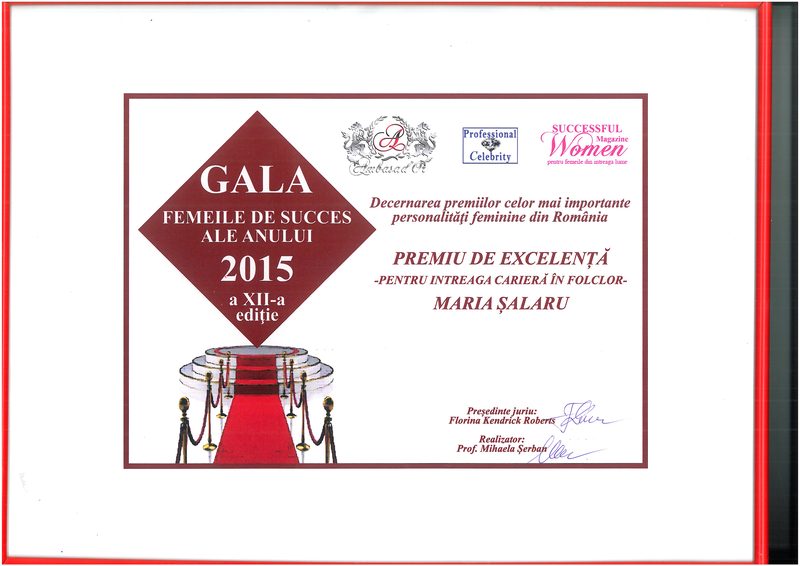 Cunoscuta interpretă de muzică populară Maria Salaru a primit joi, 17 decembrie, in Bucuresti, premiul de excelenta pentru intreaga cariera in folclor, în cadrul evenimentului „Gala Femeilor de Succes din România„, organizat de filiala românească a Asociatiei Femeilor de Succes.