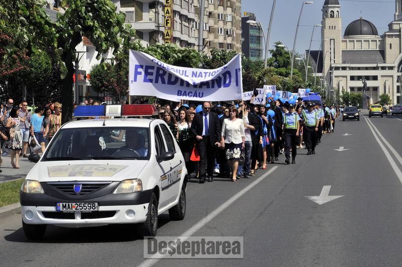 Ferdinandistii «finalisti» au defilat, cu incepere de la ora 11.00, prin centrul orasului, pâna la Universitatea „George Bacovia”, unde au organizat cursul festiv. O manifestare traditionala in care fiecare clasa si-a prezentat elevii si cele mai importante activitati desfasurate in cei patru ani de liceu, si-au luat ramas bun de la profesorii care i-au indrumat pasii, de la diriginti, dar si de la colegi.