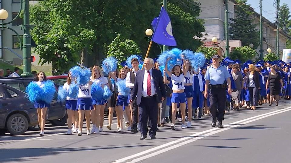 Însoțiți de mașini ce aveau boxe din care răsunau acordurile cântecului “Ani de liceu” dar șI de trupe de majorete, liceenii s-au îndreptat spre sediul Primăriei Onești, unde a fost amenajată o impozantă scenă. Pornind de la Liceul Tehnologic, din zona Casei de Cultură a Sindicatelor și străbătând partea de sus a Oneștiului, un alt șir de liceeni, cărora li s-au alăturat cei de la Colegiul Național “Grigore Moisil”(ei având în frunte pe vajnicul profesor de matematică, Gheorghe Sorta – în foto), s-au îndreptat către Primăria municipiului.