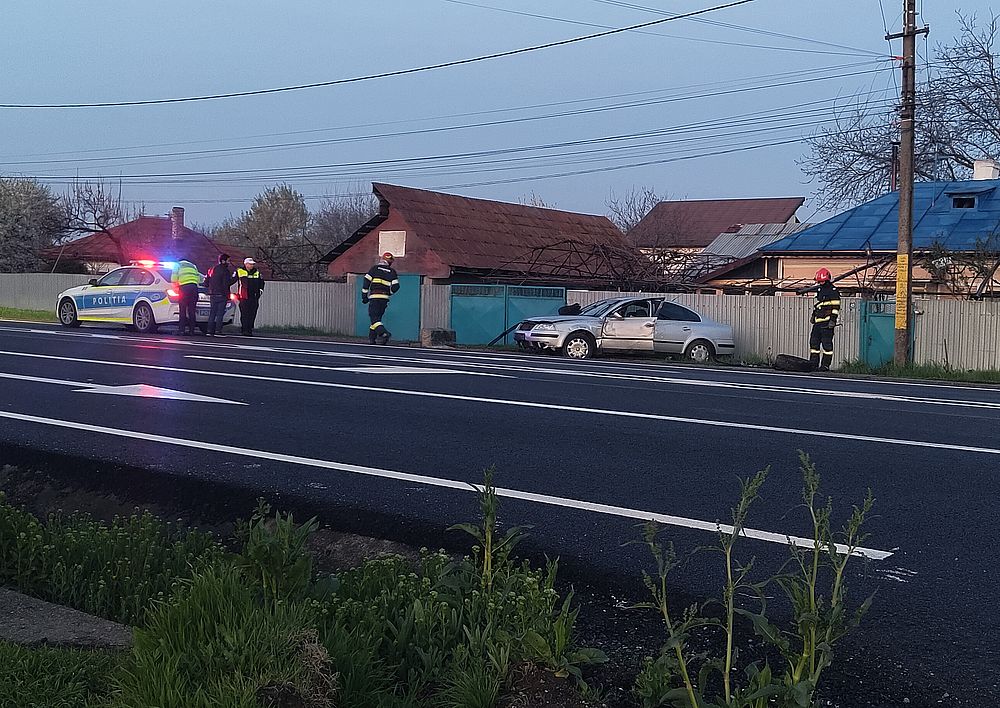 La fața locului au intervenit echipaje de poliție și pompieri pentru asigurarea zonei și verificarea situației. Din primele informații, autoturismul implicat în accident a ieșit de pe carosabil și a ajuns în afara drumului, suferind avarii vizibile.