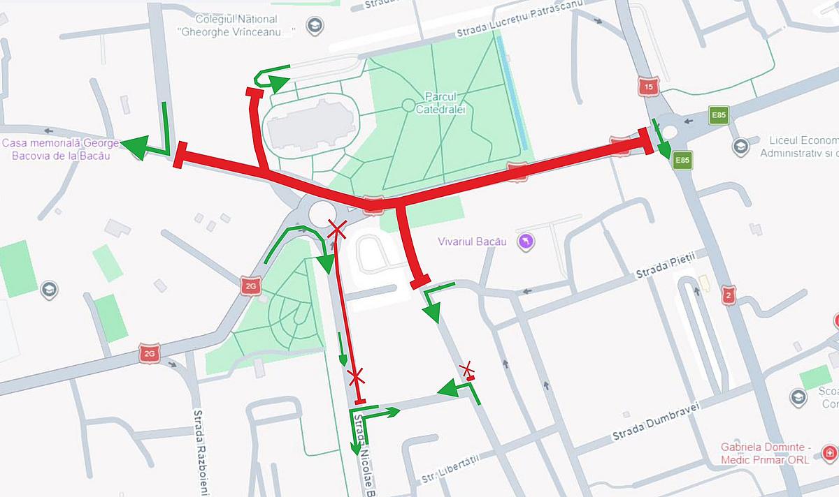 de pe str. Mihail Kogălniceanu, la intrarea în sensul giratoriu de la statuia lui Ștefan cel Mare, circulația rutieră va fi deviată spre str. B-dul Nicolae Bălcescu pe str. Lucrețiu Pătrășcanu spre str. George Bacovia, traficul se deviază pe str. 9 Mai.