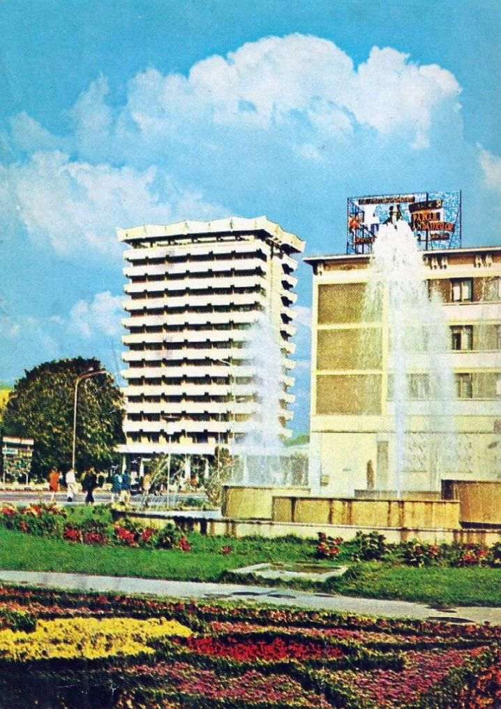 În fața hotelurilor, se întinde un spațiu verde bine întreținut, cu flori colorate și aranjamente peisagistice care reflectă grija pentru detalii și dorința de a crea un mediu plăcut și primitor. Oamenii care se plimbă pe alei aduc un plus de viață și dinamism imaginii, evocând o perioadă în care socializarea și plimbările prin centru erau o parte integrantă a vieții cotidiene.