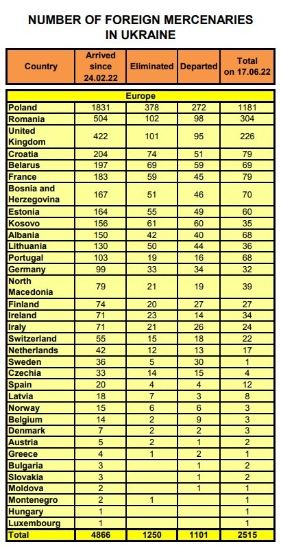 – Să aibă experiență anterioară în desfășurarea de operațiuni de salvare, cu puțin sau deloc sprijin în timpul războiului …. – Au experiență și cunoștințe cu abilități de recunoaștere a vehiculelor, aeronavelor și ambarcațiunilor navale ale armamentului militar din epoca sovietică și NATO…. – Au experiență anterioară în efectuarea de operațiuni de supraveghere/ contrasupraveghere în sectoarele de securitate privată, militar privat sau militar….. – Deține experiență anterioară ca șofer de securitate – ….” Pentru cititorii noștri dornici să acceseze aplicația în vederea angajării, dar și pentru cei care sunt doar curioși îi informăm că aceste recrutări sunt monitorizate de serviciile de securitate ruse. Astfel, după sursele oficiale ale Cremlinului citate de https://southfront.org/strikes-eliminate-hq-of-azov-battalion-in-kharkiv-russia-releases-details-on-foreign-mercenaries-in-ukraine/ situația mercenarilor încă activi, eliminați ori care au abandonat misiunea până la jumătatea acestei luni era următoarea;
