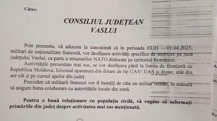 În perioada 3 ianuarie – 1 aprilie 2025, județul Vaslui va fi gazda unor activități de instruire militară desfășurate de soldați francezi, membri ai structurilor NATO dislocate pe teritoriul României. Aceste exerciții se vor desfășura până la limita de frontieră cu Republica Moldova și implică utilizarea aparaturii moderne, inclusiv drone și sisteme UAV/UAS, pentru antrenamente de recunoaștere și supraveghere.