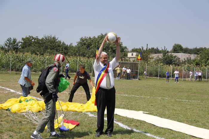 Dupa taierea panglicii, acompaniati de fanfara militara, sportivii au dat ocol terenului, iar oficialii au fost poftiti in tribuna. Dupa sfintire, a urmat cel mai spectaculos moment, unul pe care locuitorii nu-l vor uita usor: deasupra stadionului a aparut un avion care a facut câteva ture si din care a sarit parasutistul Catalin Botezatu.