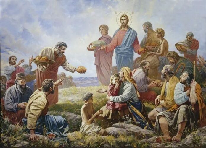 Foarte mulţi oameni Îl urmau atraşi de învăţăturile Sale dar şi de dorinţa de a primi vindecare de multele lor suferinţe. Domnului “I s-a facut milă”de ei şi le-a vindecat bolnavii (Matei XIV,13). Absorbiţi de puterea cuvântului Lui Iisus, nici nu au băgat de seamă ca s-a facut seară,aşa că ucenicii L-au rugat să dea drumul oamenilor să plece pentru a-şi găsi de mâncare prin satele din apropiere.