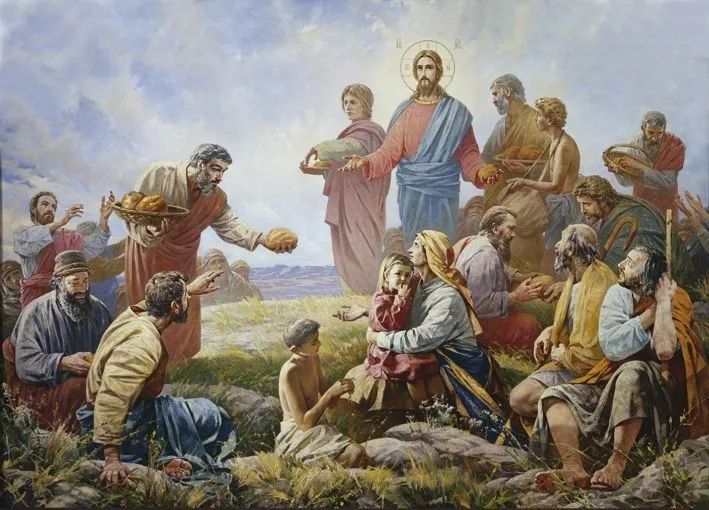 Domnul le spune :”nu trebuie să plece;daţi-le voi să mănance”,însă acolo nu erau decât cinci pâini şi doi peşti la un copil. Au adus aceste pâini la Dânsul şi “luându-le le-a binecuvântat şi frângand le-a dat mulţimilor aşezate în grupuri de câte 50-100 de persoane. Toţi s-au săturat şi apoi au strâns resturile adunându-se doăsprezece coşuri cu fărâmituri,iar oameni erau ca la cincimii afară de femei şi de copii”(Matei XIV,21).
