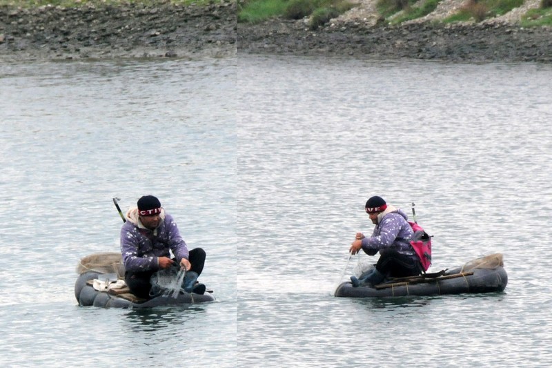 Acolo apa e stravezie, adânca si linistita. Florin scoate lanseta. Eu incerc la varga de cinci metri, cu râma la fund. La a treia aruncare intra un biban. Din dreapta, dinspre bolovani, pe mijlocul firului apei, un pescar apare la nici douazeci de metri de noi. Il vazusem mai devreme blinkerind la salau in amonte. Ambarcatiunea este confectionata dintr-o camera mare de tractor, bine ranforsata cu sfoara. Pozitia in care sta pare incomoda.