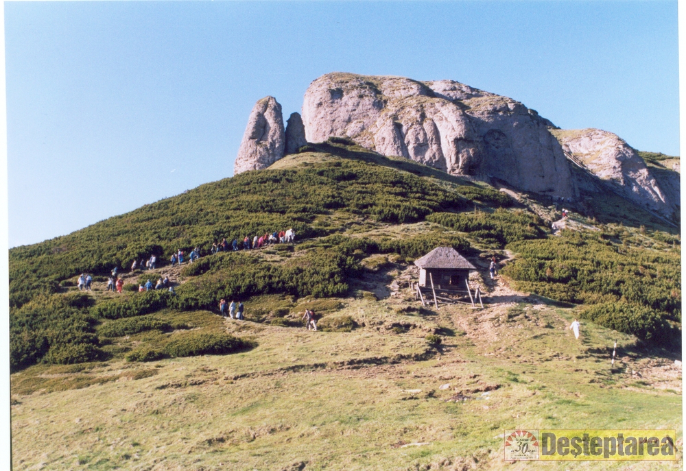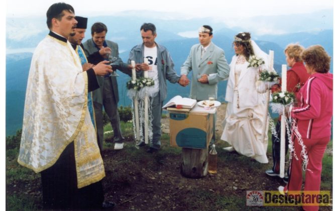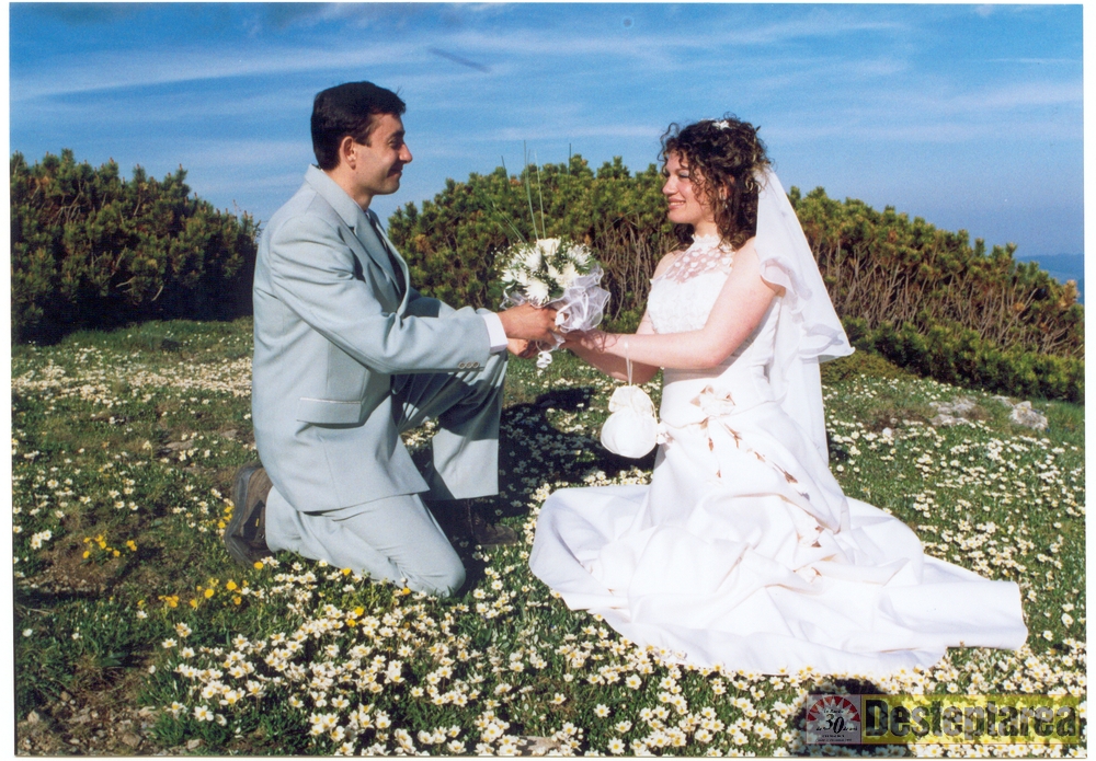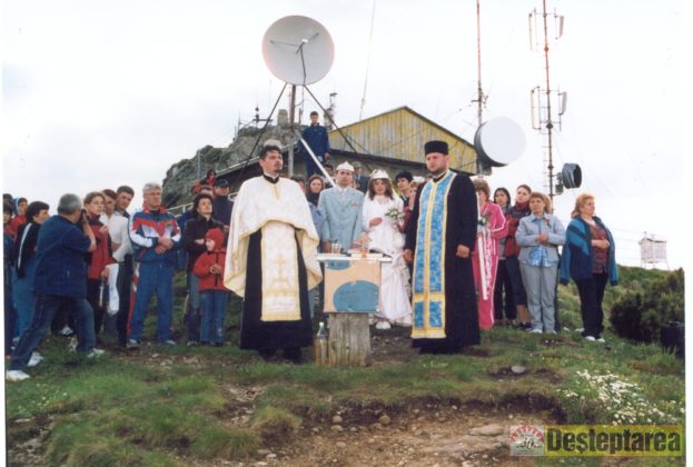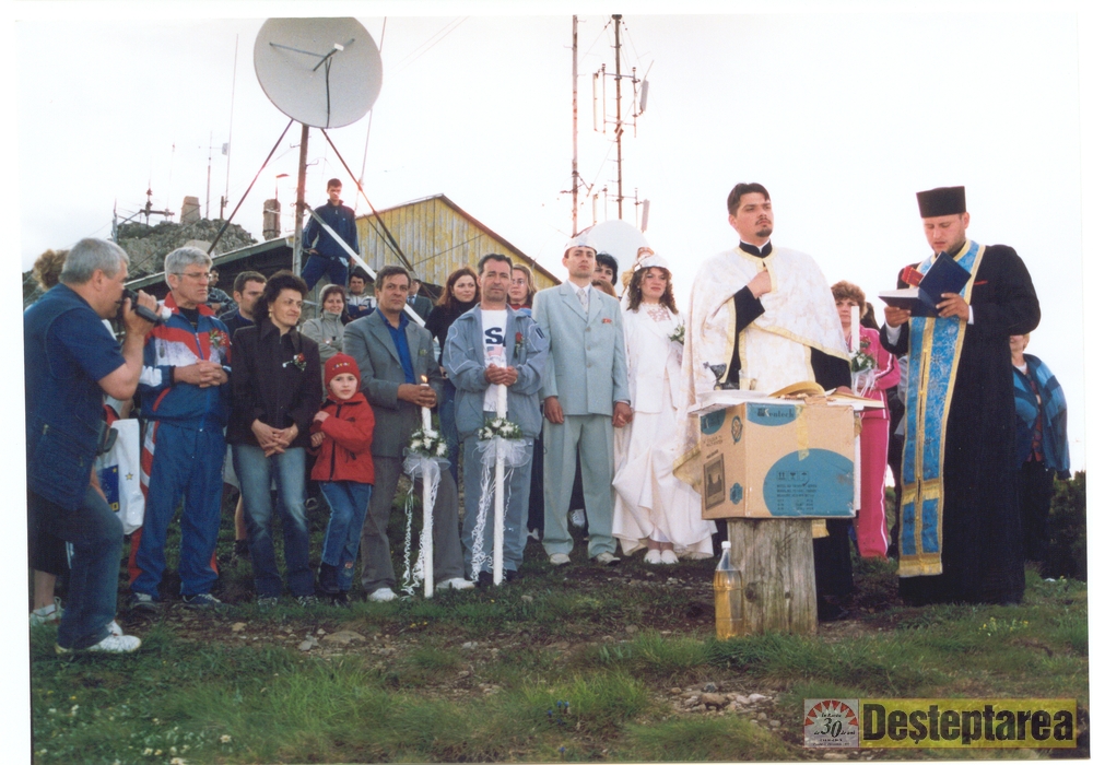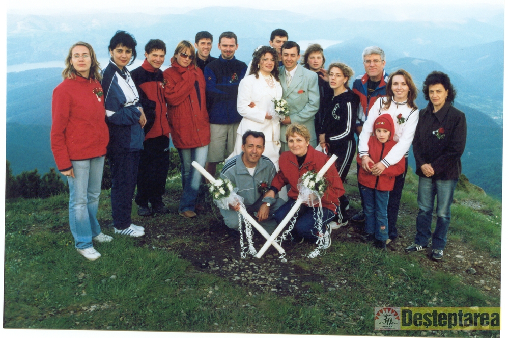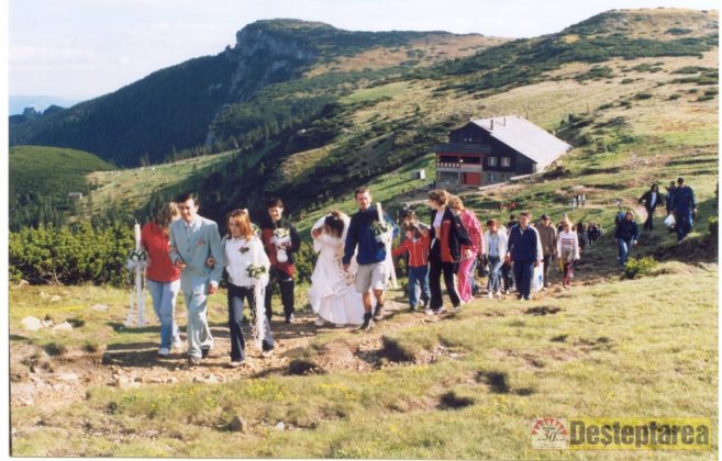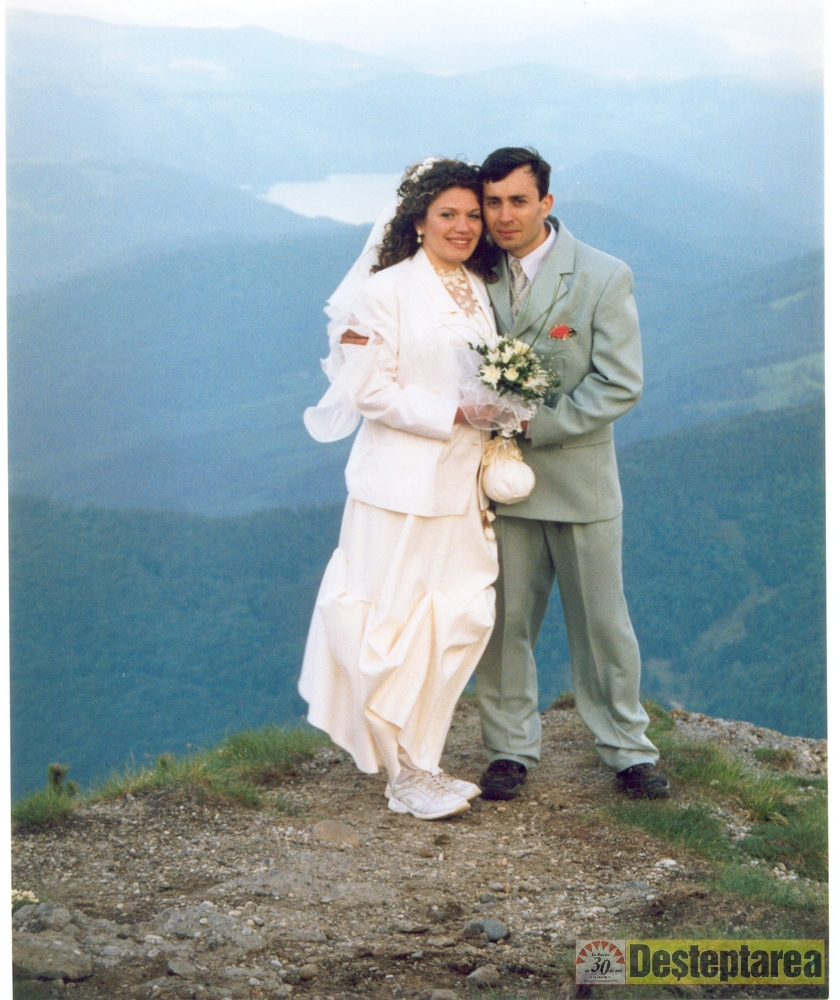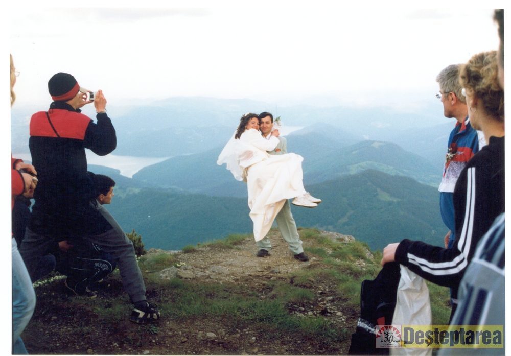 Rochia albă de mireasă și costumul deschis al mirelui, două pete de culoare și puritate contopite în măreția muntelui, erau și îndemn pentru cei care urcau pentru prima dată la o asemenea altitudine. Membri ai Clubului de Ecologie și Turism „Veniți cu noi” din Bacău, tinerii căsătoriți au o mare pasiune, adăugând iubirii lor iubirea pentru crestele înalte. Liviu are 26 ani și este kinetoterapeut în Bacău, iar Simona, 20 ani, este studentă tot la kinetoterapie. Muntele și drumețiile i-au apropiat și mai mult. Peripețiile lor, povestite cu haz, stârnind de multe ori amuzamentul prietenilor din club. Masa, dansul și felicitările au avut loc la Cabana Dochia. Gazda, cabanierul Todirel Țigănici, s-a străduit să le asigure confortul și buna dispoziție până a doua zi dimineață.