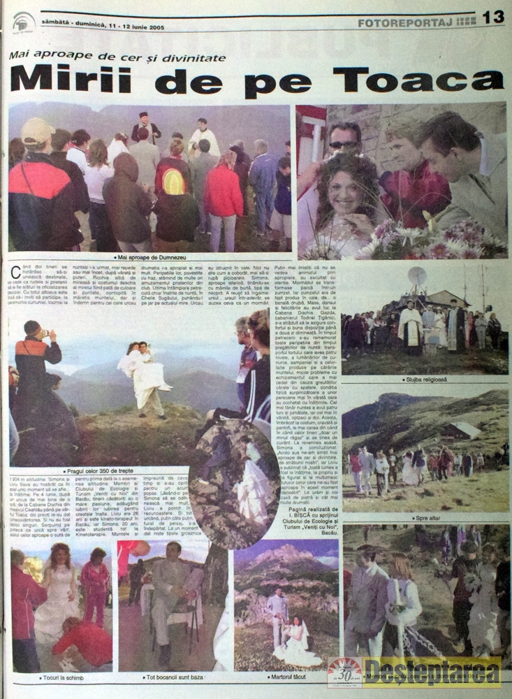 „Au fost mai aproape de cer și de divinitate. Când doi tineri se hotărăsc să-și unească destinele, se cade ca rudele și prietenii să le fie alături la oficializarea deciziei. Cu totul altceva este să-i invite să participe, la ceremonia cununiei, tocmai la 1.904 m altitudine. Simona și Liviu Sava din Bacău au hotărât ca, în acel moment, să se afle… la înălțime. Se întâmpla în anul 2005. Pe 4 iunie, după un urcuș de mai bine de o oră de la Cabana Dochia din masivul Ceahlău până pe vârful Toaca, doi preoți le-au dat binecuvântarea. Și nu au fost deloc singuri. Ocolașul Mare le-a fost martor. Șerpuind pe poteca ce urcă spre vârf, alaiul celor aproape o sută de nuntași i-a urmat, mai repede sau mai încet, după vârstă și puteri.