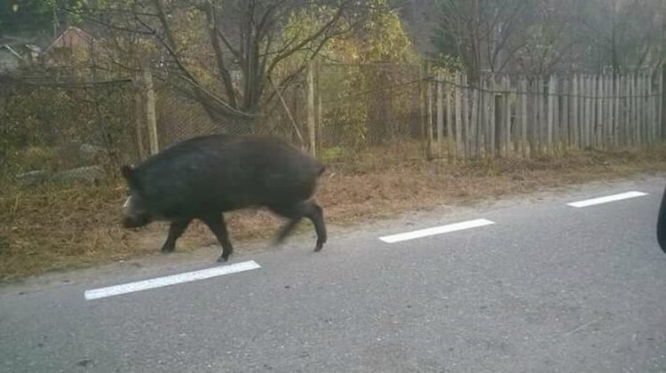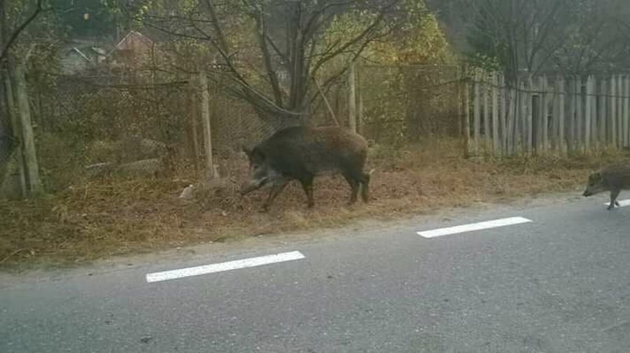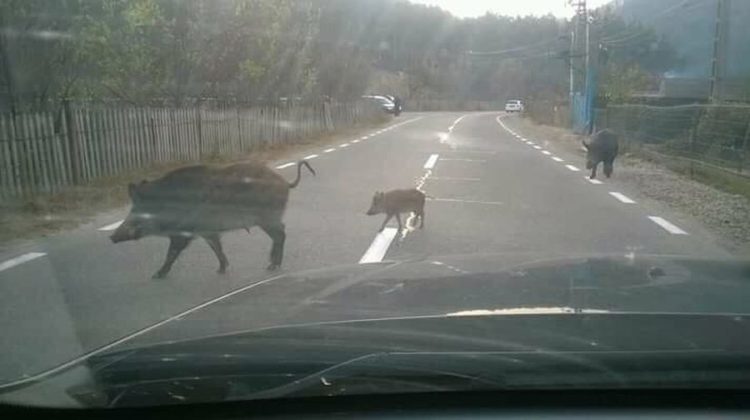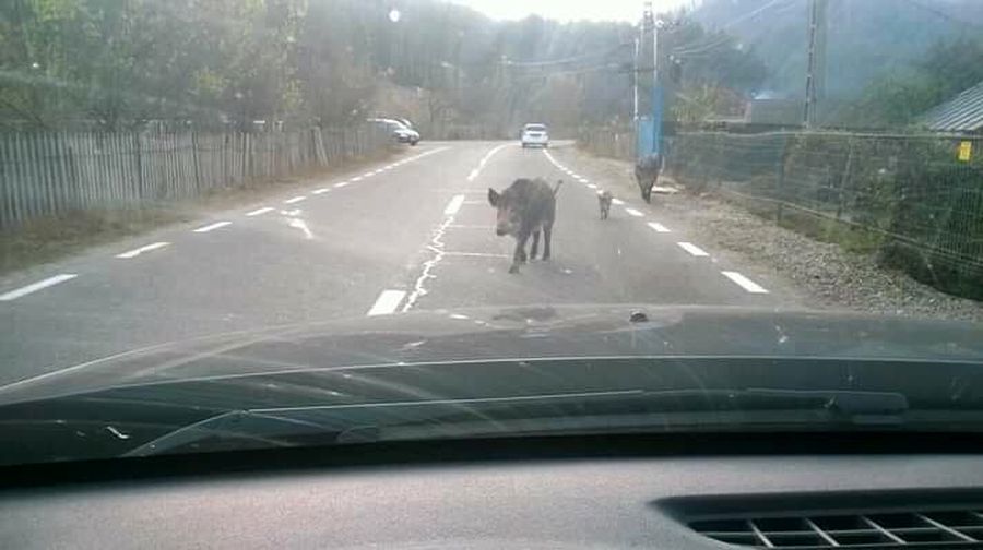 O pereche de mistreți a ieșit la asfalt ziua printre mașini în comuna Zemes. Trecătorii au imortalizat momentul.