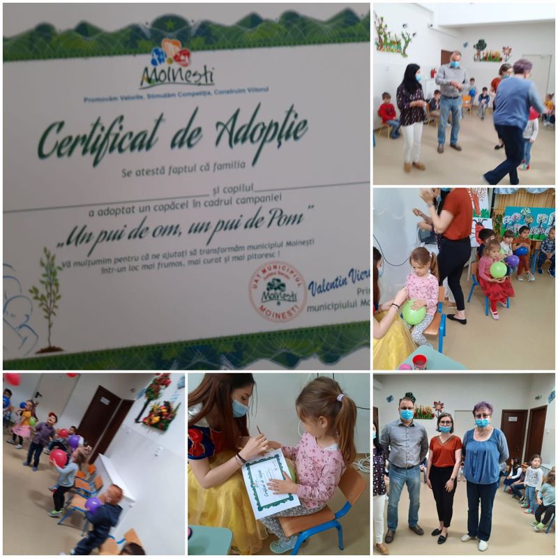 Aflată la cea de a șaptea ediție și desfășurată în condițiile stării de alertă din cauza pandemiei, Campania „Un pui de om, un pui de pom” – primăvara 2021, a debutat luni, la Moinești. Principalul scop al acțiunii  este educarea, conștientizarea și informarea cu privire la necesitatea protejării mediului înconjurător și formarea eco-prichindeilor din instituțiile de învățământ preșcolar moineștene înscrise în campanie! Activitățile se vor desfășura în mai multe grădinițe din localitate, iar micuților adoptatori li se vor înmâna și certificatul de adopție și plăcuța de identificare a arborilor deja plantați în arealul spațiului verde al unității școlare în care învață. Totul, se va desfășura numai cu respectarea măsurilor sanitare, într-o ambianță de poveste, cu animatori, facepaiting, baloane, muzică și dans. Luni Campania s-a derulat la Grădinița Ghiocelui, marți va fi la Grădinița Pinnochio Văsâiești, miercuri la Grădinița Cheița de Aur, iar joi, la Grădinița Pinochio, din localitate.
