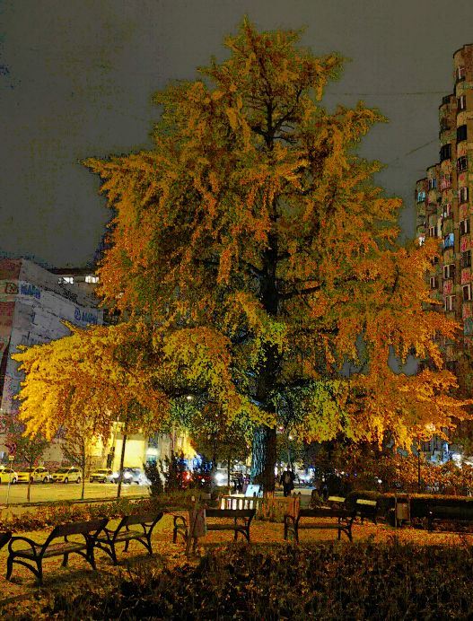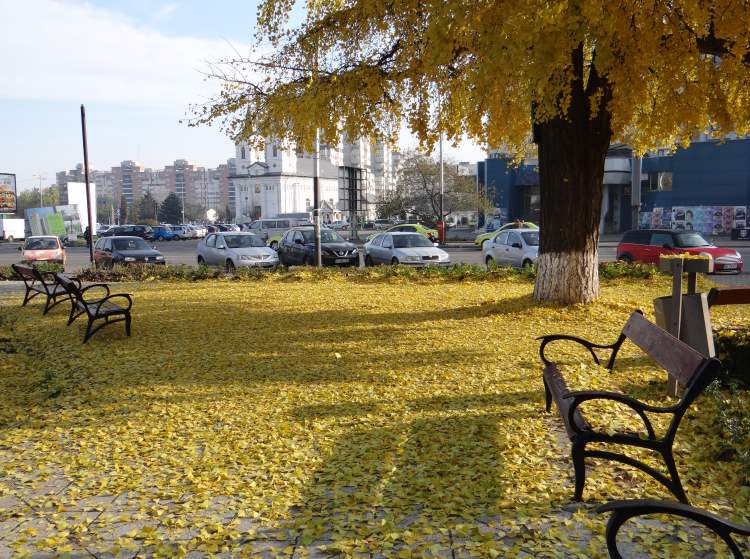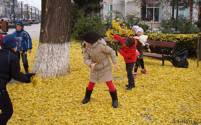 Două instantanee rămân în memorie: dimineaţă – o surpriză plăcută pentru pietonii înfriguraţi, prea grăbiţi spre locul de muncă. Se reacţionează aproape identic, trecându-se rapid de la uimire la un invariabil zâmbet larg. Nimeni, dar absolut nimeni, parcă sub vraja unui puseu al copilăriei, nu a rezistat tentaţiei de a-şi afunda pantofii în covorul de un galben pur, dar parcă prea insolent faţă de plumburiul începutului de zi. După-amiază a venit rândul celor mici să se bucure cu adevărat, sub coroana de acum golaşă a arborelui pagodelor organizându-se ad-hoc adevărate „bulgăreli”…