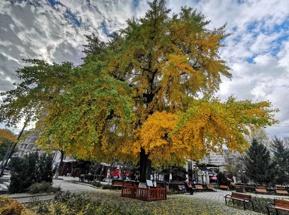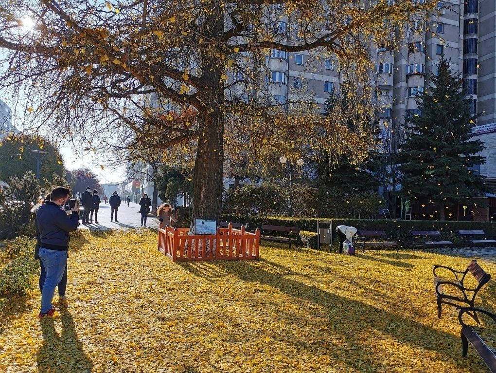 Generalizarea telefoanelor smart şi creşterea numărului de utilizatori ai reţelelor sociale prezintă efecte pozitive nebănuite până de curând. Unul dintre acestea este sporirea vizibilităţii în mediul on-line a elementelor naturale sau antropice, cu efect asupra percepţiei, (re)cunoaşterii şi promovării pe plan local şi naţional. La îndemână ne este (şi) falnicul arbore al pagodelor (Ginkgo biloba) din Parcul Trandafirilor, exemplar care a căpătat în ultimii ani o mare popularitate în rândul băcăuanilor. Cunoscut de multă vreme prin virtuţile sale terapeutice, elegantul solitar al acestei specii relicte cu totul deosebite1 a început să atragă tot mai mult privirile la fiecare mijloc de toamnă, prin galbenul electrizant al frunzelor sale bilobate şi mai ales prin „ploaia de aur” care încântă trecătorii, deveniţi instantaneu şi fotografi de ocazie. Fenomenul căderii frunzelor într-un interval foarte scurt de timp (uneori doar câteva ore, adevărat „moment de graţie” în limbajul artiştilor fotografi) nu este singular în lumea vegetală, dar intensitatea şi frecvenţa lui autumnală prezintă caracteristici remarcabile. La baza acestei revolte caduce există un cumul de condiţii meteorologice suprapuse unei specificităţi morfologice a frunzelor (peţiol lung de 5-8 cm, modul de inserare pe crenguţe, în grupuri de 3-4 ş.a.).