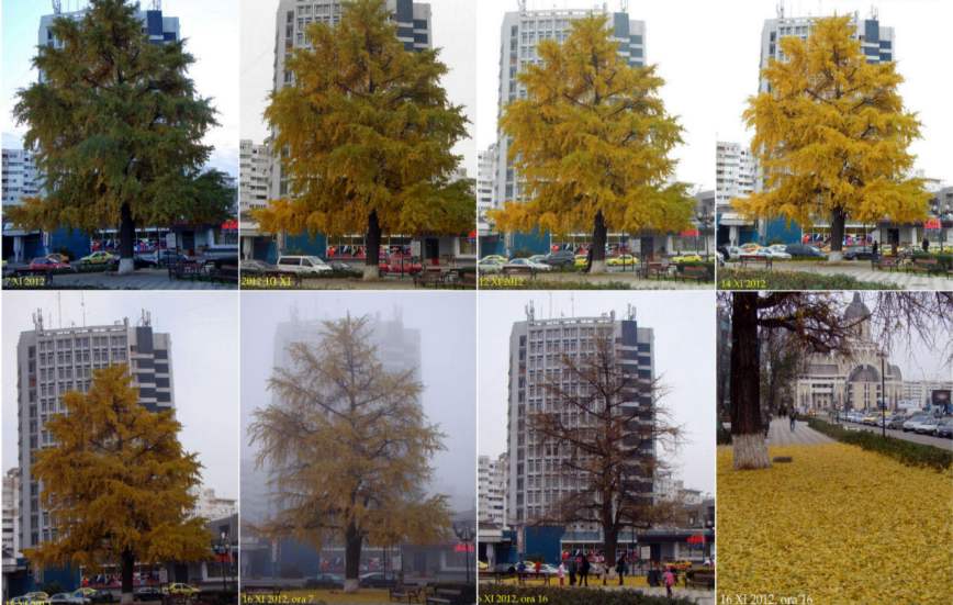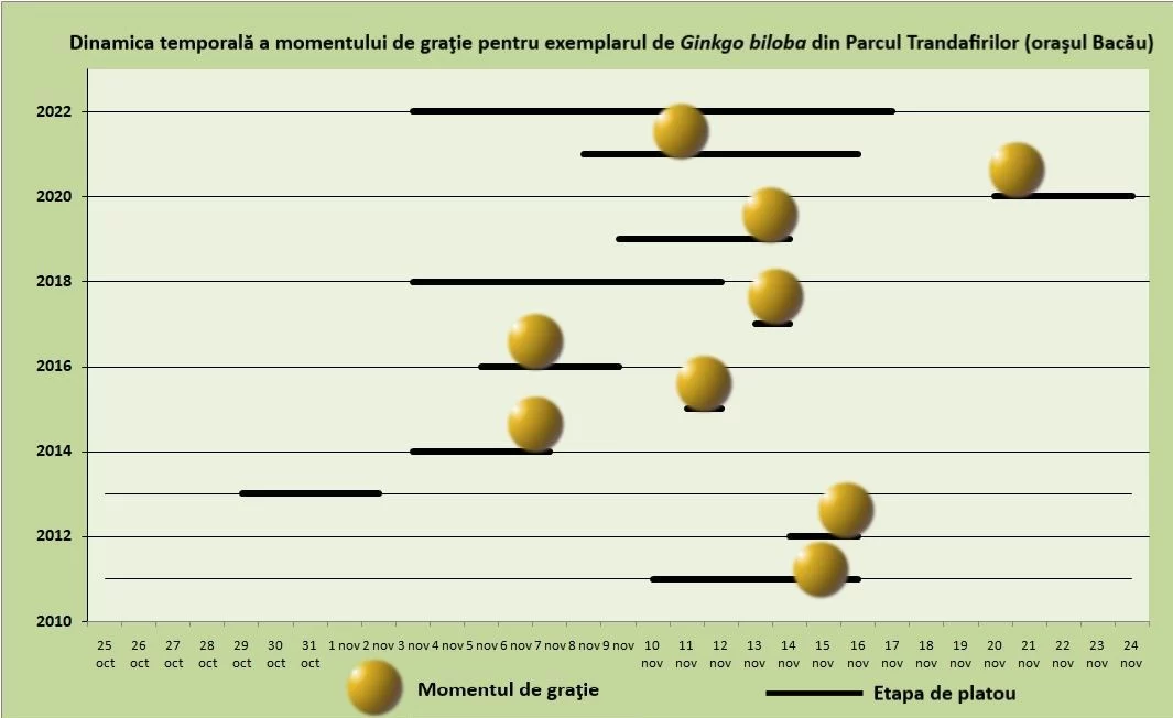 Arhiva foto personală şi bazele de date meteo accesibile on-line permit câteva consideraţii legate de perioada în care Ginkgo biloba îşi etalează culoarea aurie, momentul căderii rapide a frunzelor şi dinamica temporală a acestor fenofaze (2011 – 2022). Am fost selectate trei ani deosebiți, în care desprinderea de pe ramuri a galbenului-auriu, prin durata foarte scurtă, a reprezentat un adevărat spectacol oferit cu generozitate băcăuanilor: