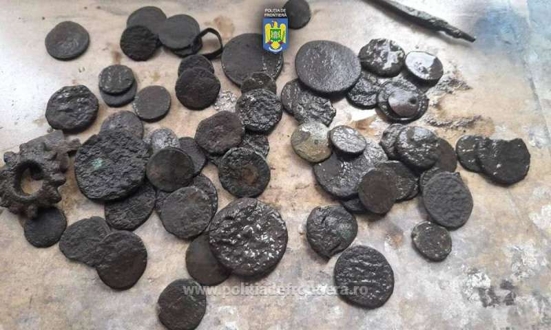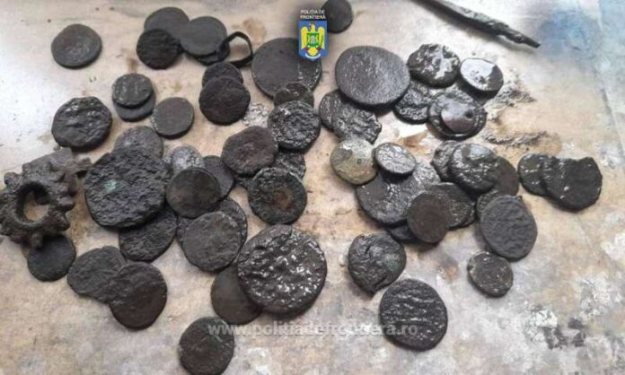 În timpul unui control detaliat al mijlocului de transport, polițiștii de frontieră din cadrul Gărzii de Coastă au găsit într-o sticlă de plastic nu mai puțin de 62 de monede cu inscripții în limba latină, precum și patru obiecte. De asemenea, au fost descoperite trei detectoare de metale, utilizate cel mai probabil pentru a căuta comori arheologice.