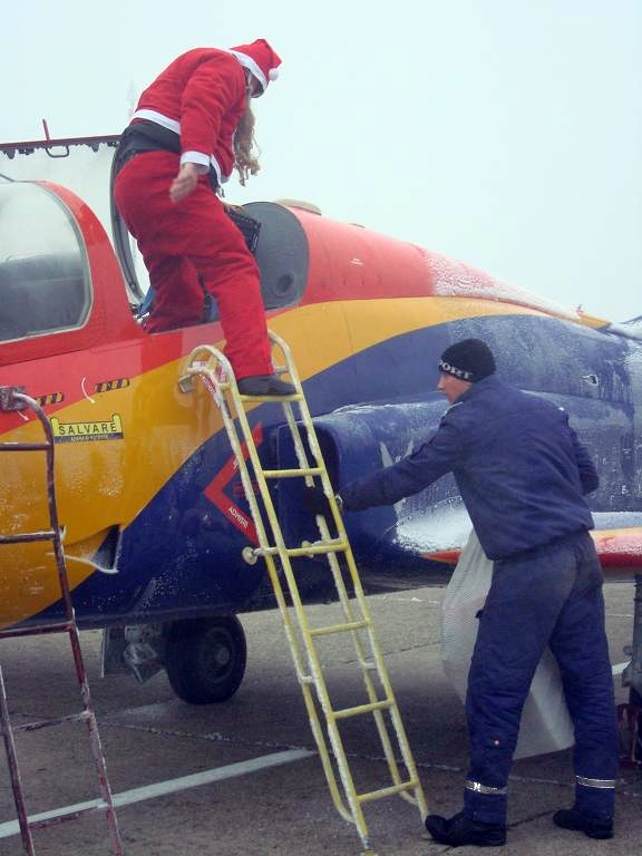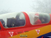 Vineri dimineata, putin dupa ora 9.00, Mos Craciun a aparut din ceata pe una din bretelele Bazei 95 Aeriene Bacau. El a coborat dintr-un avion IAR 99 Soim, dubla comanda si a facut deliciul celor care il asteptau.