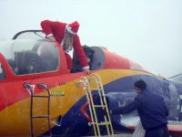 Comandorul Valerica Vrajescu, comandantul Bazei 95 Aeriene Bacau si aproximativ 100 de persoane, copii si militari, l-au intampinat pe Mos Craciun la scara avionului si l-au in clubul unitatii, ca sa se incalzeasca si sa-si descarce sacul cu daruri pentru copii.