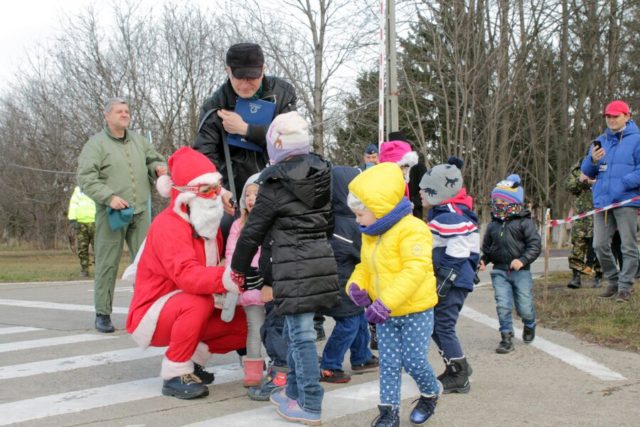 Aterizarea a fost perfectă și a făcut deliciul copiilor militarilor de la Baza 95 Aeriană care l-au așteptat la marginea pistei. Moș Crăciun a fost invitat în sala de festivități a unității militare unde s-au împărțit cadouri și a fost organizat un moment artistic.