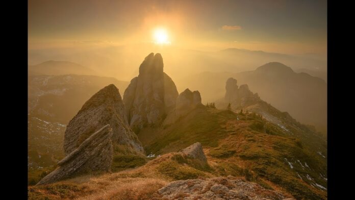 Imagini spectaculoase cu munți împăduriți la răsărit, un cerb care se oprește în luminiș, păsări rare zburând peste lacuri, un alpinist escaladând o stâncă abruptă, un grup de drumeți explorând o potecă de munte, un ciclist pedalând printr-o pădure deasă și un speolog descoperind formațiuni spectaculoase într-o peșteră.