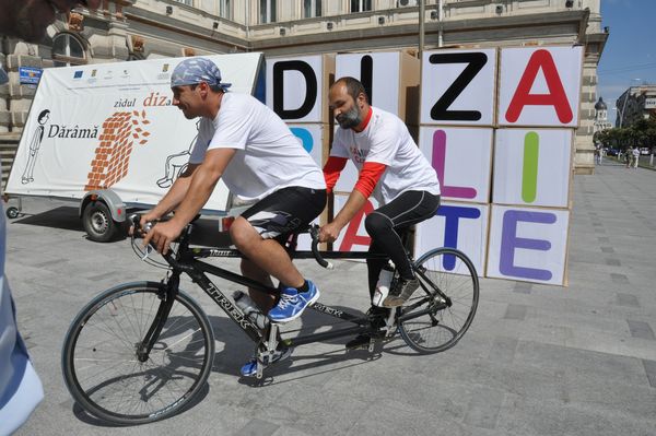 Turul este facut de doua echipe, care se deplaseaza cu bicicleta, in tandem, cu face permanent Florin Georgescu, nevazator, impreuna cu insotitorul lui, persoana normala. Anul trecut, Florin Georgescu a parcurs, in tandem 2500 de km, pâna la Londra, la JO, pentru a demonstra ca se poate”. ne-a declarat Peter Hurley, expert in comunicare, ASOC – Baia Mare. Cei doi ciclisti au daramat un zid din carton, pe care era inscriptionat cuvântul DIZABILITATE, dupa care mai multe persoane cu dizabilitati s-au plimbat cu bicicleta, in aplauzele celor prezenti.