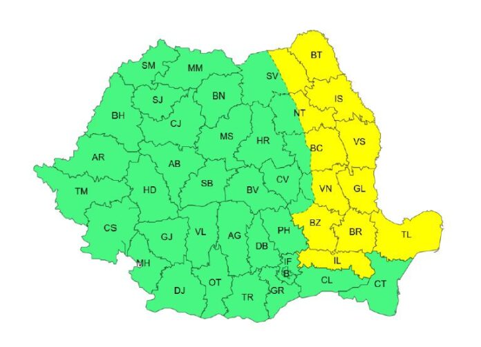 ANM a emis o atenționare COD GALBEN de ninsoare viscolită pentru Moldova, nord-estul și estul Munteniei și nordul Dobrogei, valabilă pe 15 februarie, între orele 05:00 și 18:00. În acest interval, se așteaptă ninsori viscolite, intensificări ale vântului de 50 – 65 km/h și reducerea vizibilității sub 100 m.