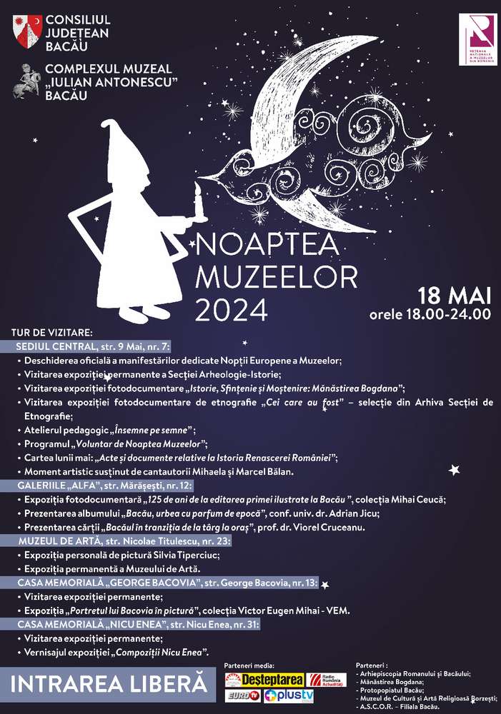 Complexul Muzeal „Iulian Antonescu” Bacău organizează şi în acest an, în data de 18 mai, alături de instituţii culturale europene, un eveniment de tradiție: Noaptea Muzeelor. Inițiatorul acestei manifestări europene de larg interes cultural și educativ a fost Ministerul Culturii şi Comunicării din Franţa. Ideea ministerului francez s-a dovedit una de succes în cadrul spațiului european, fiind patronată de Consiliul Europei, de UNESCO și de Consiliul Internaţional al Muzeelor, la ea participând instituții culturale publice și private din țările membre ale Consiliului Europei, dar existând și participanți din afara continentului.