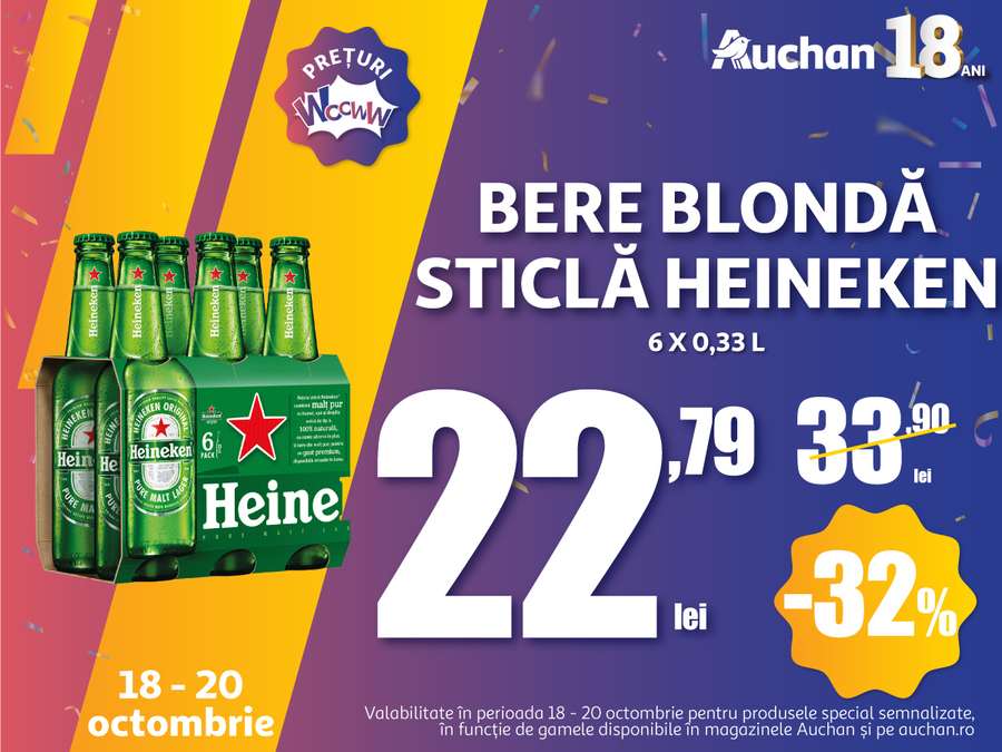 - Bere blondă sticlă Heineken 6 x 0,33 l, cu o reducere de 32%, la 22.79 lei