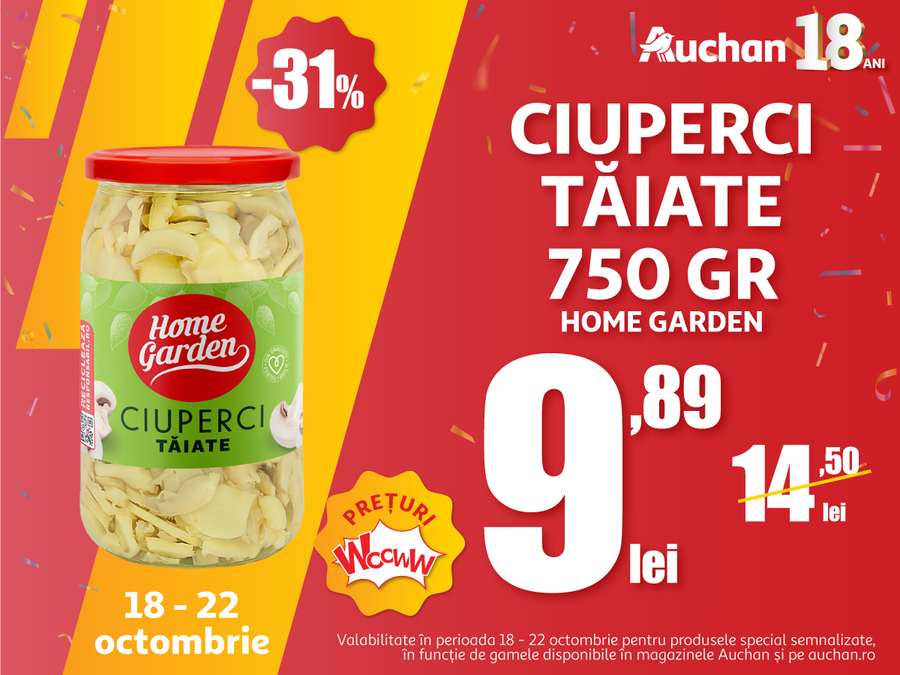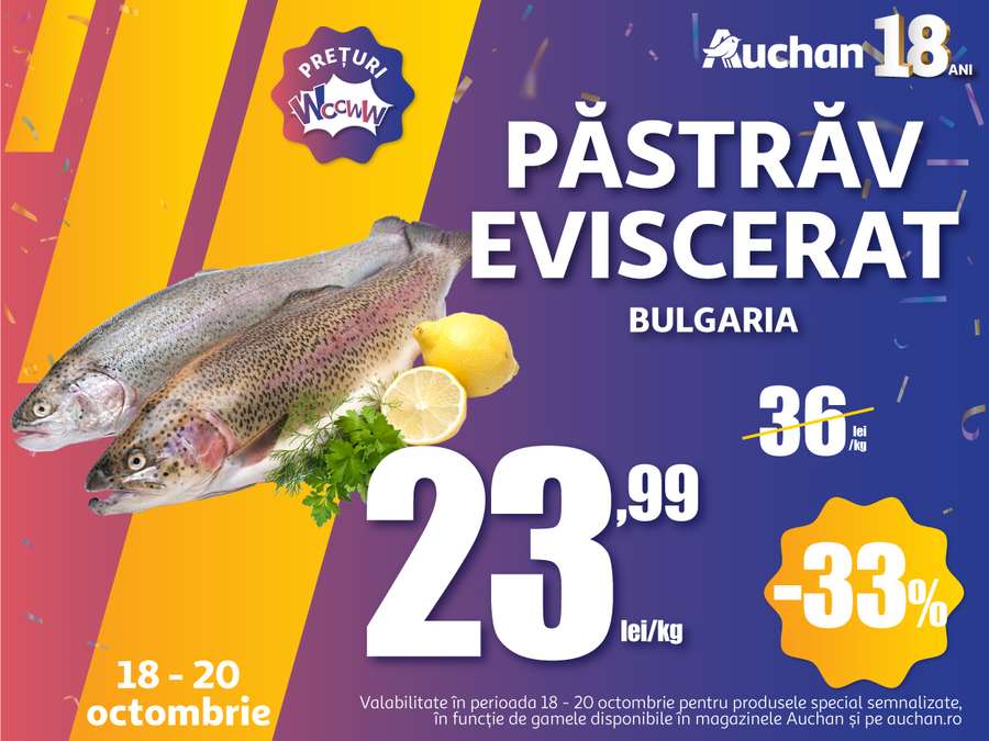 Cât despre ofertele speciale, iată o parte dintre reducerile de care poți beneficia vizitând magazinele Auchan în perioada 18 – 20 octombrie: