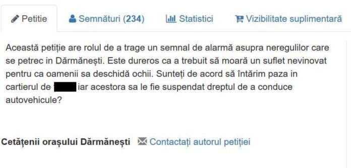 „Această petiție are rolul de a trage un semnal de alarmă asupra neregulilor care se petrec în Dărmănești. Este dureros că a trebuit să moară un suflet nevinovat pentru ca oamenii să deschidă ochii. Sunteți de acord să întărim paza în cartierul de [cuvânt interzis, n.n.] iar acestora să le fie suspendat dreptul de a conduce autovehicule?”