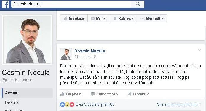 Un mesaj publicat pe pagina de facebook a primarului Cosmin Necula prin care cerea parintilor sa-si ia copiii acasa de la scoala a stârnit o adevarata isterie in oras.