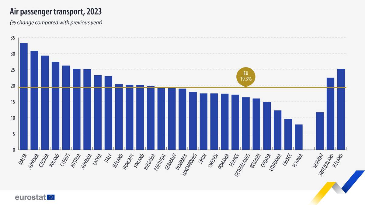 Datele Eurostat arată că toate statele membre UE au înregistrat o creștere a numărului de pasageri transportați pe calea aerului comparativ cu 2022. Cele mai mari creșteri au fost raportate în Malta (+33,3%), Slovenia (+30,9%) și Cehia (+29,4%). În contrast, cele mai mici creșteri s-au înregistrat în Estonia (+7,9%), Grecia (+9,6%) și Lituania (+12,3%).