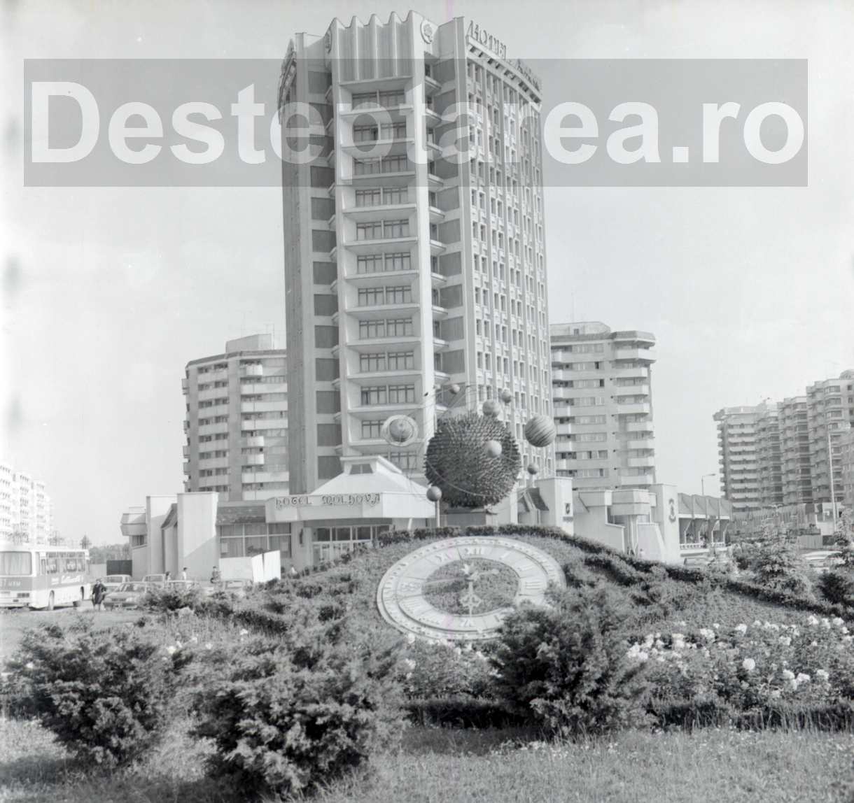 Fotografia redă o viziune nostalgică asupra unui punct de referință urban care a dominat peisajul orașului Bacău pentru mai mulți ani – ceasul floral situat lângă Hotelul Moldova. Această creație excepțională a fost realizată de maestrul ceasornicar Popovici Victor și a fost îmbogățită de o lucrare ceramică impresionantă, ilustrând sistemul solar, semnătura inconfundabilă a artistului plastic-ceramist Anton Ciobanu.