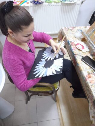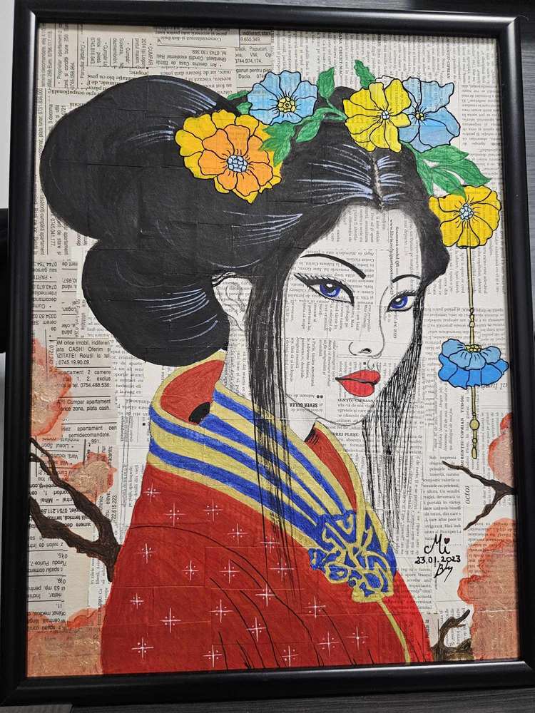 -Exact. Ideea e că eu nu eram străină de pictură pentru că eu pictam de când eram copil. După ce am născut, stând acasă cu copilul am început să pictez pereții locuinței. Așa am simțit nevoia. Pictam oameni, copaci, orice. Tot ce simțeam în sufletul meu puneam în picturile mele. Uneori mă mai inspir, ca toată lumea, dar de fiecare dată, îmi pun amprenta mea. Mergând la școală, nu m-am limitat la a face ce face toată lumea, întotdeauna m-am dus spre pictura de décor. Mi-am găsit un stil aparte, domunul Macovei m-a lăsat să mă dezvolt așa cum am vrut eu. Adică nu mi-a impus ceva… M-a lăsat și mi-a dat încredere că pot. Așa… mi-am descoperit stilul în a face pictură pe ziar. Efectiv iau planșa, lipesc bucăți de ziar după care desenez în creion și apoi îl pictez. Îmbin creionul cu acrilul și cu ziarul. Ăsta este stilul meu și asta îmi place. Asta mă definește pe mine. Sigur, fac și altceva. Nu e asta o problemă.