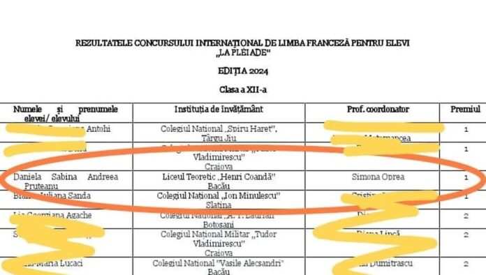Daniela Pruteanu, elevă în clasa a 12-a la Liceul Teoretic „Henri Coandă” din Bacău, a adus bucurie și mândrie școlii sale obținând recent Premiul I la prestigiosul concurs internațional de limba franceză „La Pléiade”. Evenimentul a fost organizat de Facultatea de Litere, Istorie și Teologie din Timișoara.