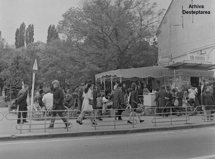 O imagine surprinsă probabil în anii ’60-’70 ne oferă o fereastră spre trecutul Bacăului. Fotografia, realizată în alb-negru, surprinde o zonă animată, unde oamenii se plimbă, socializează și se relaxează pe terasa unei cofetării sau cafenele.