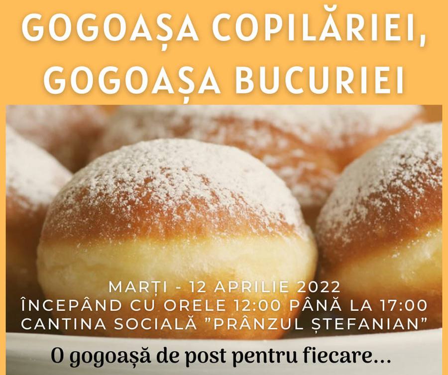 Gogoașa Bucuriei va sta la Masa Bucuriei în Onești, cu începere din 12 aprilie. Inițiativa „Gogoașa Copilăriei, Gogoașa Bucuriei” aparține Protoieriei din municipiu, care, pentru că suntem în Postul Mare al Paștelui, ne invită pe fiecare, cu mic, cu mare, la o gogoașă de post, începând de marți, 12 aprilie, până în Joia Mare, între orele 12,00 și 17,00 la Cantina „Prânzul Ștefanian” de la sediul Protopopiatului din Onești.