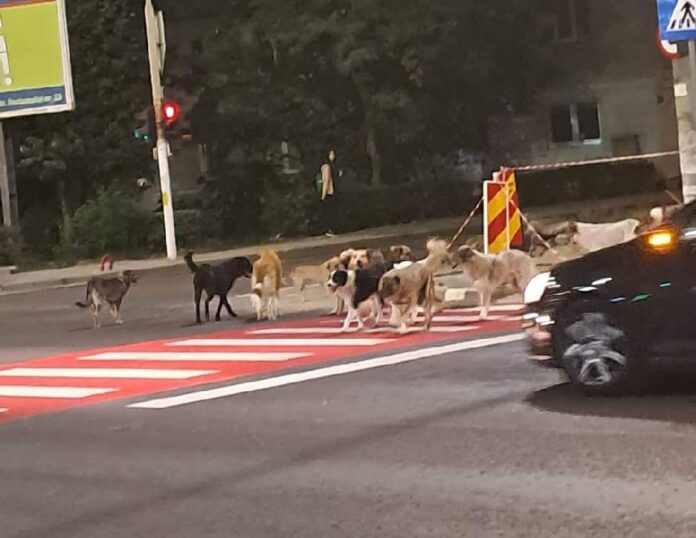 Imaginile au fost surprinse aseară în zona Străzii Miorița, unde o haită de câini a apărut peste noapte, semănând panică în rândul localnicilor.