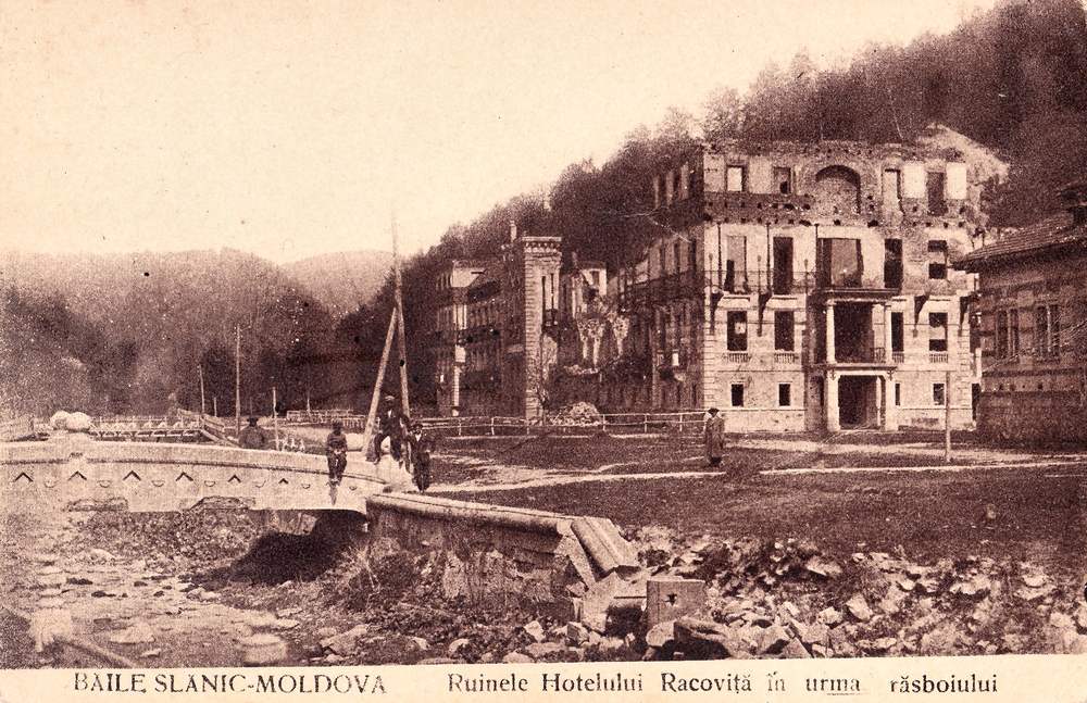 Din cercetările întreprinse, ca și din lucrările publicate până la această dată despre istoricul stațiunii Slănic-Moldova, nu există la momentul actual, o situație clară a pagubelor înregistrate în localitate în timpul războiului și nici dacă ele au fost produse doar de inamici, sau poate și de alți combatanți. Se amintește doar faptul că în urma bombardamentelor inamicului, Slănicul devenise o ruină și că refacerea lui a început mult mai târziu. Să exemplificăm: ,,Din strălucirea Slănicului de altă dată, din clădirile semețe, din instalațiile moderne, n-au rămas decât ruini la terminarea războiului, mormane de piatră și cărămidă, mărturie a acelor timpuri grozanice prin care a trecut. Vilele de altădată, biserica, instalațiile, totul fu distrus de nemilosul dușman în furia-i oarbă. Numai cine a cunoscut Slănicul înainte de război și-a putut da seama de efectele distrugătoare asupra acestei localități și și-a putut explica de ce refacerea stațiunii a trebuit să întârzie atât de mult, până în 1922. (…) Nici una însă dintre ruinele Slănicului nu impresionează mai mult ca acea podoabă din vremurile de strălucire ale Slănicului, ca ruinele de azi ale hotelului Racoviță. Azi, (anul 1932), ruinele rămân pentru noi, martore dureroase ale războiului. Și cu atâțt mai dureroase ne apar, cu cât au trecut 14 ani de la război și nu s-a putut face nimic pentru el, nici împiedica ruinarea lui mai departe”. (Cleopatra Tăutu, ,,Slănicul-Moldovei. Monografie scrisă în anii 1930 – 1934”, București, Tipografia ziarului ,,Universul”, 1935, pp 36 – 42);