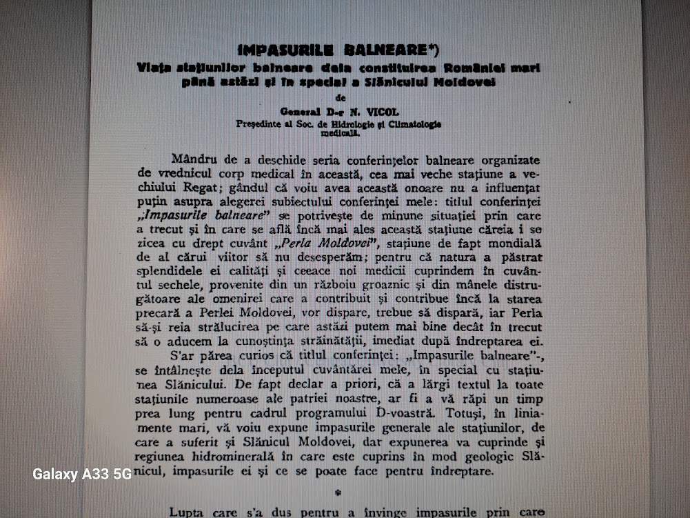 În programul manifestărilor au fost incluse mai multe conferințe, printre care și cea a gen. dr. Nicolae Vicol, președintele Societății de Hidrologie și Climatologie, intitulată ,,Impasurile balneare. Viata staţiunilor balneare de la constituirea României Mari până astăzi si în special a Slănicului Moldovei”. Bineînțeles, conferința susținută de gen. dr. Nicolae Vicol a fost una mai extinsă, drept pentru care, am extras fragmentul care ne interesează și care merită cu prisosință citit. Și iată cele afirmate și argumentate de gen. dr. Nicolae Vicol: