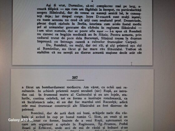 Da, Românii, nu mulţi, dar cei răi, şi alţi prieteni aşa zişi ai Românilor, au făcut şi fac mare rău Slănicului. Trebue să stabilim că nu nemţii au distrus această staţiune decât atât cât a făcut un bombardament mediocru. Am văzut, cu ochii mei, rezultatele. În schimb prietenii noştri seculari (sic) Ruşii, au introdus cai în frumosul teatru al Cazinoului şi au ars lojele, stalurile, cortina celebră, tot ce forma o instituţie românească, doar ca să încălzească sala; ei au dat foc marelui hotel `Racoviţă`; adică cele mai frumoase construcţii ale Slănicului au fost distruse de prieteni. Românii, dar de astă dată cei buni, echipele mele din război şi având în cap pe bunul român Gheorghe Sion (proprietar de vilă la Slănic, ilustru cărturar și mare filantrop, zis și Iorgu, n. a.), au venit şi au rechiziţionat cu forme, înainte de a veni ruşii, aşternuturi cu care am organizat 4 spitale la Ruginoasa, Târgu-Frumos, Podu Iloaiei şi Erbiceni, unde zeci de mii de răniţi şi bolnavi şi-au găsit alinarea şi sănătatea. Cât datoreşte Slănicului armata şi ţara e de nespus. În sfârşit, Slănicul a ajuns în refacere; greu, căci era complet distrus, să spunem drept, unii epitropi nu au înţeles cum să procedeze, afară doar că unul dintre ei a spus o vorbă celebră la locul ei azi (bine înţeles la figurat): `Am să apăr cu revolverul drepturile Slănicului`. Eu am mai avut atingere cu Slănicul căci, după războiu, am fost însărcinat, împreună cu regretatul inginer şi academician Gheorghe Balș, să alcătuim un program de refacere a Slănicului. Dacă s’ar fi urmat acel plan, de ani Epitropia ar fi avut un Slănic refăcut întreg şi mai modernizat. Proprietarii particulari ai vilelor au fost mai vrednici în refacerea vilelor lor. Slănicul a perdut timpul favorabil”.